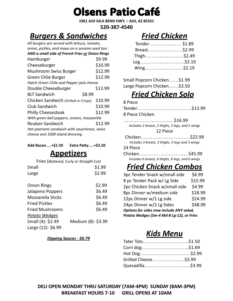 Welcome to Olsens Patio Cafe, a hidden gem located at 1961 N Ajo Gila Bend Hwy in Ajo, Arizona. This delightful cafe is not just a place to grab a bite, but a warm, welcoming spot where community and comfort food blend beautifully.